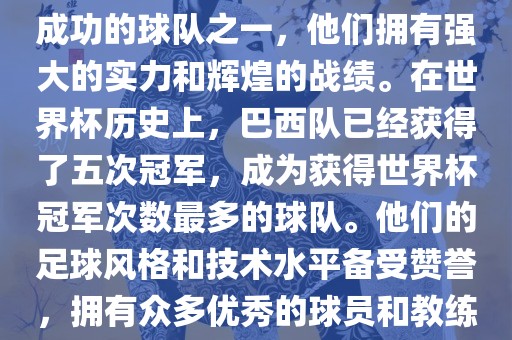 巴西足球队是世界杯历史上最成功的球队之一,他们拥有强大的实力和辉煌的战绩。在世界杯历史上,巴西队已经获得了五次冠军,成为获得世界杯冠军次数最多的球队。他们的足球风格和技术水平备受赞誉,拥有众多优秀的球员和教练。