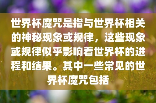 世界杯魔咒是指与世界杯相关的神秘现象或规律,这些现象或规律似乎影响着世界杯的进程和结果。其中一些常见的世界杯魔咒包括