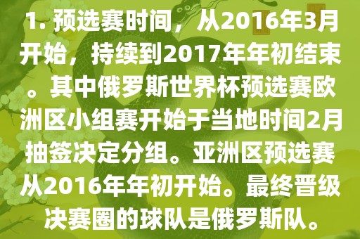 1. 预选赛时间,从2016年3月开始,持续到2017年年初结束。其中俄罗斯世界杯预选赛欧洲区小组赛开始于当地时间2月抽签决定分组。亚洲区预选赛从2016年年初开始。最终晋级决赛圈的球队是俄罗斯队。