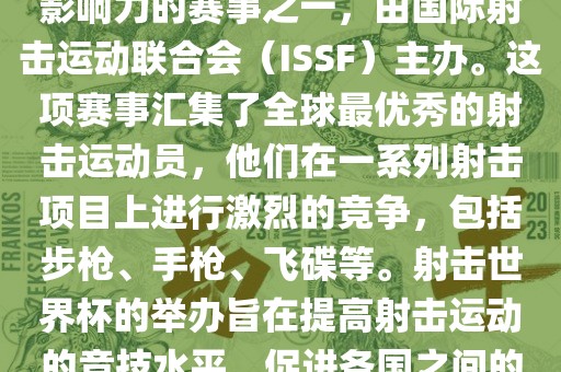 射击世界杯是射击运动中最具影响力的赛事之一,由国际射击运动联合会(ISSF)主办。这项赛事汇集了全球最优秀的射击运动员,他们在一系列射击项目上进行激烈的竞争,包括步枪、手枪、飞碟等。射击世界杯的举办旨在提高射击运动的竞技水平,促进各国之间的交流与合作。