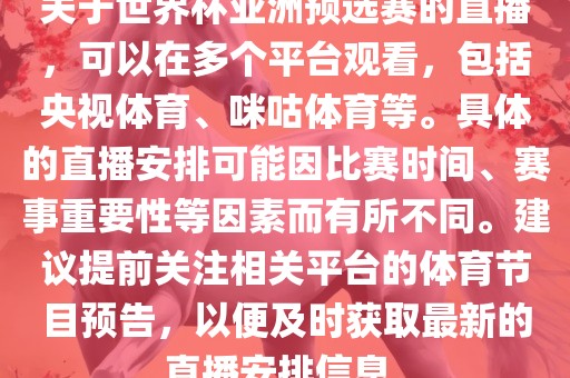 关于世界杯亚洲预选赛的直播,可以在多个平台观看,包括央视体育、咪咕体育等。具体的直播安排可能因比赛时间、赛事重要性等因素而有所不同。建议提前关注相关平台的体育节目预告,以便及时获取最新的直播安排信息。