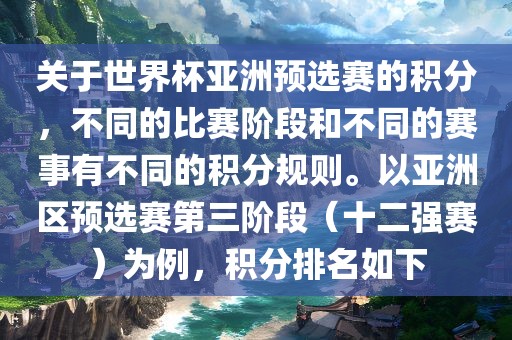 关于世界杯亚洲预选赛的积分,不同的比赛阶段和不同的赛事有不同的积分规则。以亚洲区预选赛第三阶段(十二强赛)为例,积分排名如下
