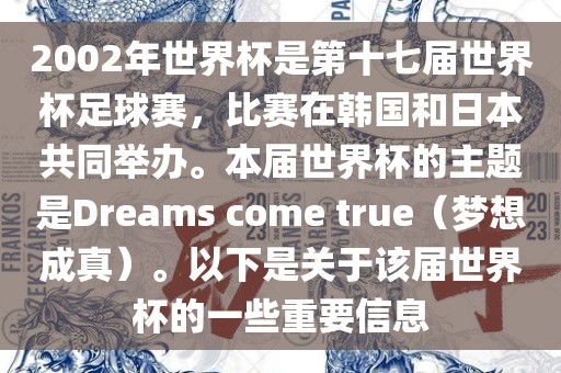 摘要:2002年世界杯足球赛是第十七届比赛,在韩国和日本共同举办,主题为Dreams come true。该届世界杯见证了众多精彩比赛和难忘的瞬间,同时也留下了许多重要信息,成为世界杯历史上的一个重要篇章。