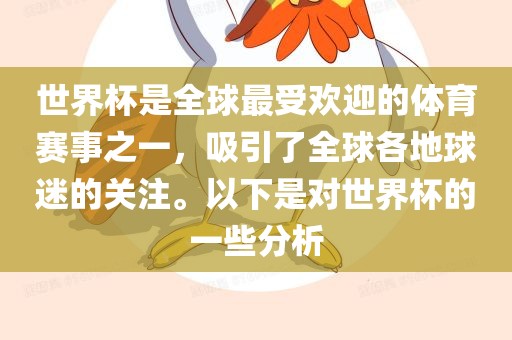 世界杯是全球最受欢迎的体育赛事之一,吸引了全球各地球迷的关注。以下是对世界杯的一些分析