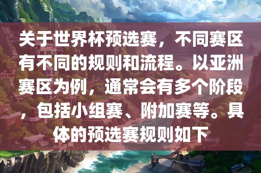 关于世界杯预选赛,不同赛区有不同的规则和流程。以亚洲赛区为例,通常会有多个阶段,包括小组赛、附加赛等。具体的预选赛规则如下