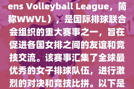 世界女排联赛(World Womens Volleyball League,简称WWVL),是国际排球联合会组织的重大赛事之一,旨在促进各国女排之间的友谊和竞技交流。该赛事汇集了全球最优秀的女子排球队伍,进行激烈的对决和竞技比拼。以下是关于世界杯女排赛的详细信息