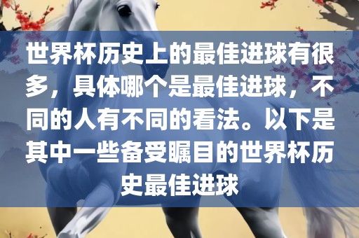 关于世界杯历史最佳进球,众说纷纭。以下是备受瞩目的几个进球简介:,,在世界杯的历史长河中,众多精彩进球留下了难以磨灭的印象。每个球迷心中都有自己心目中的最佳进球,而一些标志性进球如阿根廷球星迭戈·马拉多纳的“世纪进球”、英格兰球员加里·莱因克尔的远距离射门等,都成为了世界杯历史上的经典瞬间。这些进球以其独特的方式和震撼力,被永远铭记在足球史册中。
