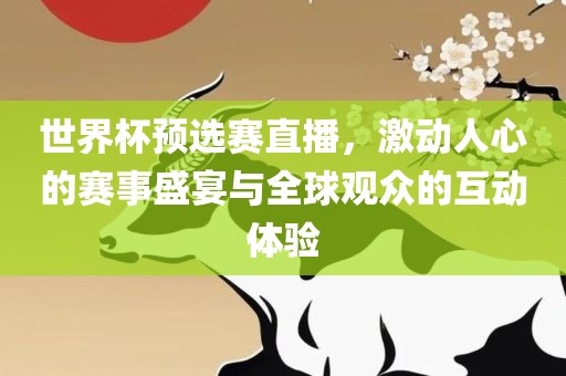 世界杯预选赛直播是一场激动人心的赛事盛宴与全球观众的互动体验,通过直播,观众们可以随时随地观看比赛,感受现场的氛围,直播还为观众们提供了与其他球迷交流的机会,让他们分享观点、交流感情,这种独特的体验让球迷们更加深入地了解足球运动,感受到足球的魅力,随着科技的发展,相信未来的世界杯预选赛直播会更加精彩,为球迷们带来更多的惊喜和乐趣。