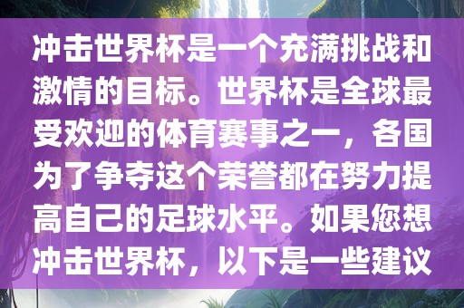冲击世界杯是一个充满挑战和激情的目标。世界杯是全球最受欢迎的体育赛事之一,各国为了争夺这个荣誉都在努力提高自己的足球水平。如果您想冲击世界杯,以下是一些建议