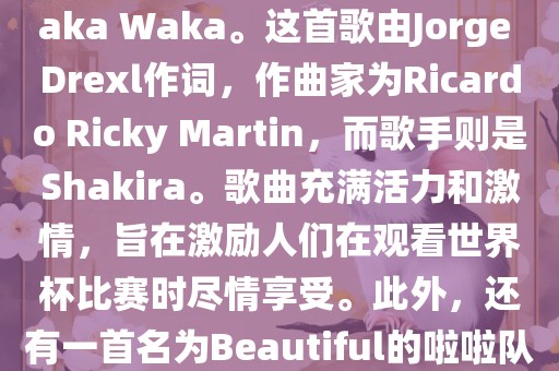 关于世界杯的啦啦队歌曲,其中有一首非常著名的歌曲是Waka Waka。这首歌由Jorge Drexl作词,作曲家为Ricardo Ricky Martin,而歌手则是Shakira。歌曲充满活力和激情,旨在激励人们在观看世界杯比赛时尽情享受。此外,还有一首名为Beautiful的啦啦队歌曲,同样充满了活力和热情。