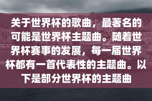 关于世界杯的歌曲,最著名的可能是世界杯主题曲。随着世界杯赛事的发展,每一届世界杯都有一首代表性的主题曲。以下是部分世界杯的主题曲