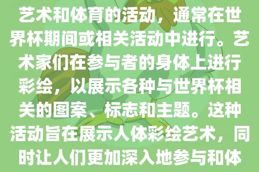 人体彩绘世界杯是一种结合了艺术和体育的活动,通常在世界杯期间或相关活动中进行。艺术家们在参与者的身体上进行彩绘,以展示各种与世界杯相关的图案、标志和主题。这种活动旨在展示人体彩绘艺术,同时让人们更加深入地参与和体验世界杯的氛围。