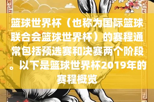 篮球世界杯(也称为国际篮球联合会篮球世界杯)的赛程通常包括预选赛和决赛两个阶段。以下是篮球世界杯2019年的赛程概览