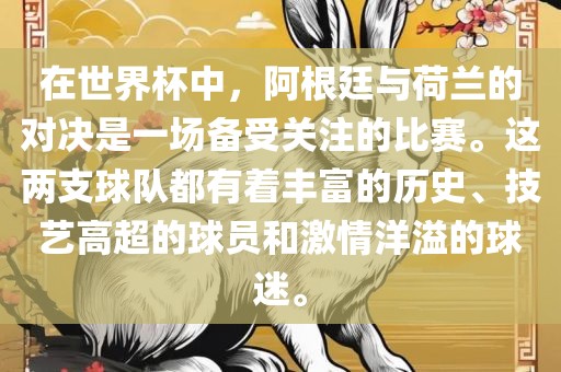 摘要:世界杯中,阿根廷与荷兰的对决备受瞩目。两支球队拥有辉煌历史和技艺高超的球员,各自拥有激情洋溢的球迷群体。这场对决无疑将成为一场精彩绝伦的较量,吸引了全球球迷的关注。