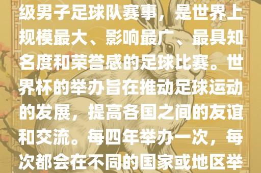 世界杯是由国际足球联合会主办的一项国家级男子足球队赛事,是世界上规模最大、影响最广的足球比赛。旨在推动足球运动的发展,增进各国之间的友谊和交流,每四年举办一次。世界杯历史悠久,自1930年举办以来,已经成功举办了二十几届,对于足球爱好者来说具有极高的荣誉感和知名度。